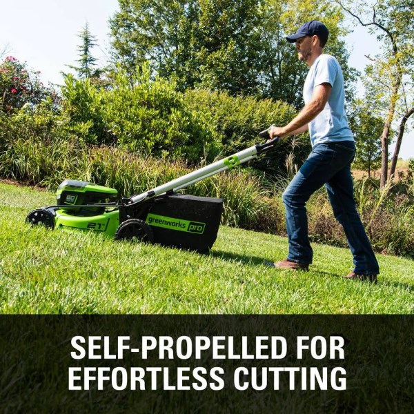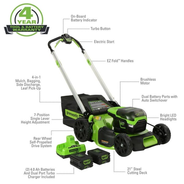 • Greenworks Pro 21 in. 60V Battery Cordless Self-Propelled Walk-Behind Lawn Mower with (2) 4.0 Ah Battery and Charger