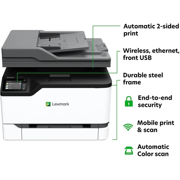 A multifunctional unit for small workgroups, the MC3326i Multifunction Color Laser Printer from Lexmark offers printing, scanning, and copying functions to fulfill your imaging needs. This model produces sharp text and prints in black or color at speeds as fast as 26 ppm while supporting paper sizes up to 8.5 x 14″, and for handling media the printer comes equipped with a 250-sheet paper tray and a 100-sheet output bin. A single-sheet manual feed slot is also provided for card stock, specialty papers, and fragile documents. A flatbed scanner with an automatic document feeder lets you scan documents up to 8.5 x 14″, and scan file formats include TIFF, PDF, JPEG, and JPG. Additionally, the unit features multiple scan destinations, including scan to e-mail, USB, networked computers, and FTP. Black and color copy speeds are an impressive 26 cpm, and copy functions include reduce and enlarge functions from 25 to 400%. You can quickly check and change settings via the 2.8″ LCD touch panel, and the unit offers USB 2.0 and Ethernet ports in the back for connecting to a computer. The MC3326i also features Wi-Fi connectivity, and the unit has mobile printing capabilities via Apple AirPrint, Mopria, and the Lexmark Mobile Print app. For security, the unit utilizes Lexmark’s full-spectrum security architecture to keep your information safe, and the built-in energy-saving mode goes from sleep to print to sleep with nothing to set.